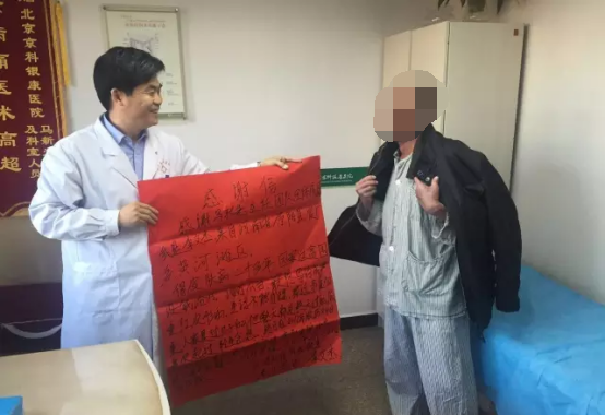 今天早晨,已经入院13天的张大海(化名)突然来到马新光主任的诊室,只见张大海手中拿着一张大幅红纸,令人惊讶的是,那张红纸上面却写了密密麻麻的字,第一行“感谢信”三个字分外醒目。张大哥说,他写了一份感谢信要送给马主任,信写的有些不正规,字也比较潦草,但都是他的心理话啊!